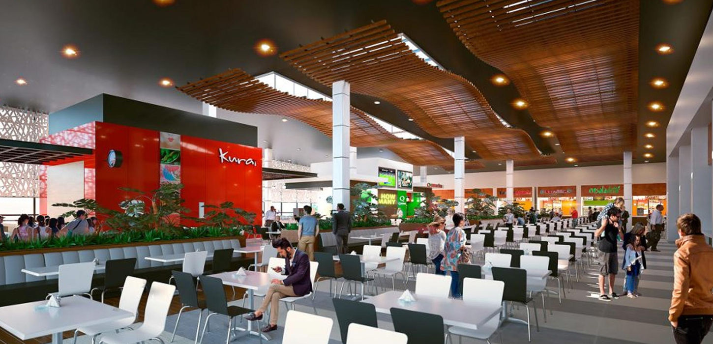 Área de comidas rápidas diseñada para optimizar circulación y servicio. Su distribución moderna crea un ambiente dinámico que mejora la experiencia de los visitantes dentro del centro comercial.